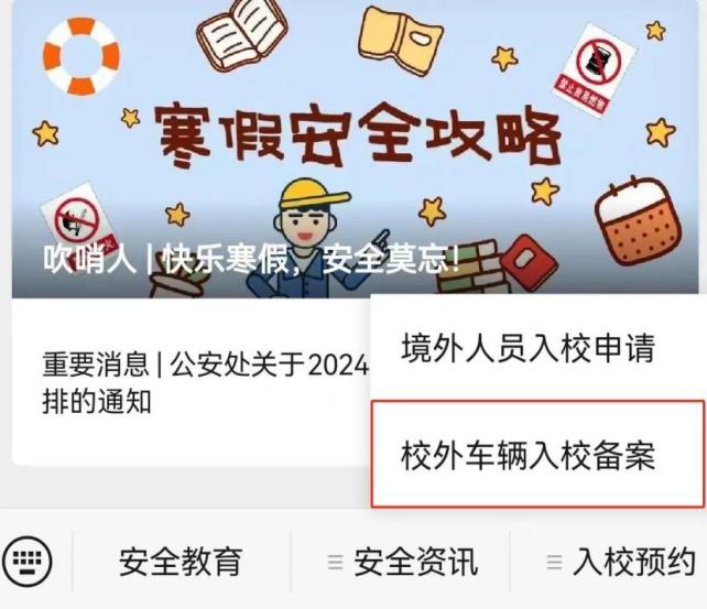 可通过微信公众号“平安新葡的京集团35222vip”中“入校预约”—“校外车辆入校备案”进行登记备案,备案后方可通过机动车入口扫描车牌入校。