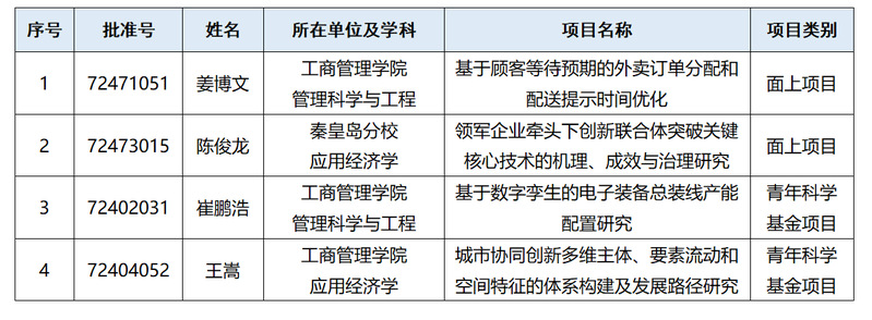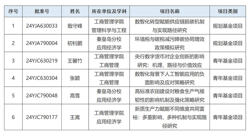2024年,新葡的京官网共获批国家自然科学基金3项(面上项目1项、青年项目2项),国家社会科学基金一般项目1项,教育部人文社科基金项目4项(规划基金1项、青年基金3项)。此外,作为经管学科共建单位,新葡的京集团35222vip秦皇岛分校经济学院、管理学院本年度共获批国家自然科学基金1项(面上项目),教育部人文社科基金项目2项(规划基金1项、青年基金1项)。